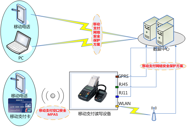 下(xià)圖所示為(wèi)移動支付安全整體(tǐ)解決方案,其中MPAS用(yòng)于保護移動支付空(kōng)中接口的(de)安全。