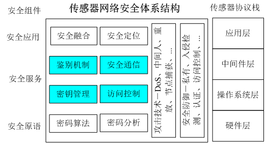 如(rú)下(xià)圖所示的(de)适用(yòng)于傳感器(qì)網絡安全體(tǐ)系結構,具體(tǐ)包括密碼算(suàn)法、密鑰管Ω理(lǐ)、鑒别機(jī)制(zhì)、安全通(tōng)信、入侵檢測、DoS攻擊、訪問(wèn)控制(zhì)等安全技(jì)術(shù)。