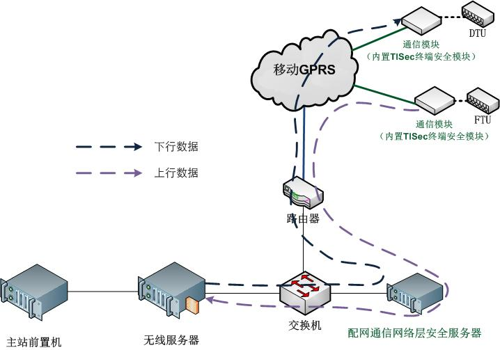 采用(yòng)TISec系統對(duì)通(tōng)信模塊從(cóng)網絡層進行(xíng)必要(yào)的(de)加固,不(bù)但(dàn)↔能(néng)夠全面提升其應對(duì)網絡攻擊的(de)能(néng)力,使其安全強度與DTU/FTU等業(yè)務設備具備相✔(xiàng)同的(de)安全強度,而且不(bù)會(huì)對(duì)原系統包括應用(yòng)層₩安全加固造成任何的(de)影(yǐng)響,達到(dào)了(le)增加防禦縱深的(de)目的(de),從(cóng)而達到(dào)全面提升整體(tǐ)系統的(de)安↔全健壯性的(de)目标,滿足配網系統網絡層安全傳輸的(de)應用(yòng)需求。附圖為(wèi)TISec系統在配Ω網通(tōng)信網絡層的(de)部署拓撲。
