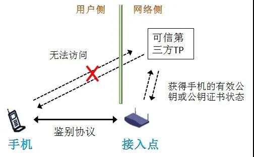 在終端嘗試接入網絡的(de)場(chǎng)景下(xià),終端無法從(cóng)網絡中的(de)可(kě)信第三方TP獲得(de)接入點的(de)憑證,因為(wèi)接入控制(zh​ì)功能(néng)要(yào)求終端完成鑒别之後才能(néng)訪問(wèn)網絡。