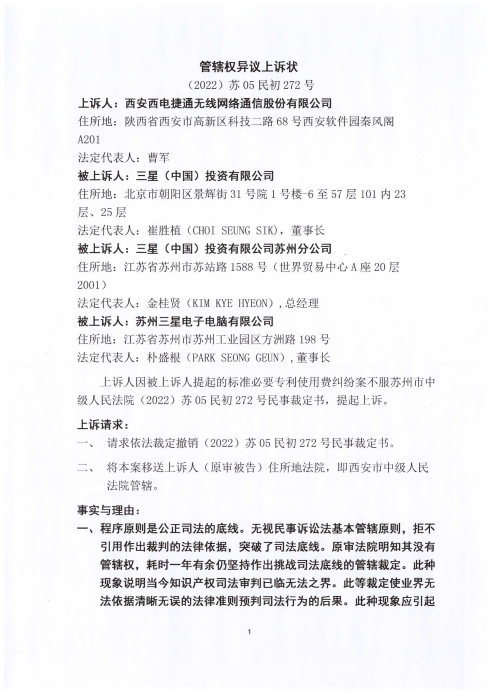 點擊閱讀(dú) 三星訴西(xī)電(diàn)捷通(tōng)标準必要(yào)專利使用(yòng)費(fèi)案司法文(wén)書(shū)(2022)蘇05民(mín)初272号、(2024)最高♥(gāo)法知(zhī)民(mín)轄終229号