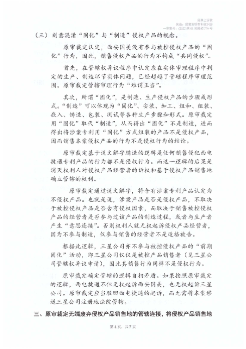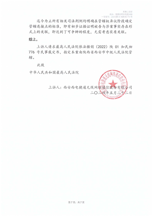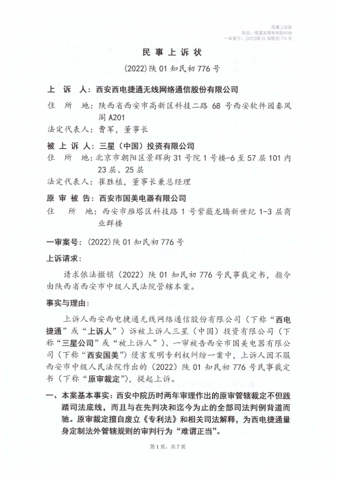 西(xī)電(diàn)捷通(tōng)就(jiù)西(xī)電(diàn)捷通(tōng)訴三星标準必要(yào)專利侵權案管轄異議(yì)一(yī)審裁定Ω(2022)陝01知(zhī)民(mín)初776号的(de)上(shàng)訴狀原文(wén)